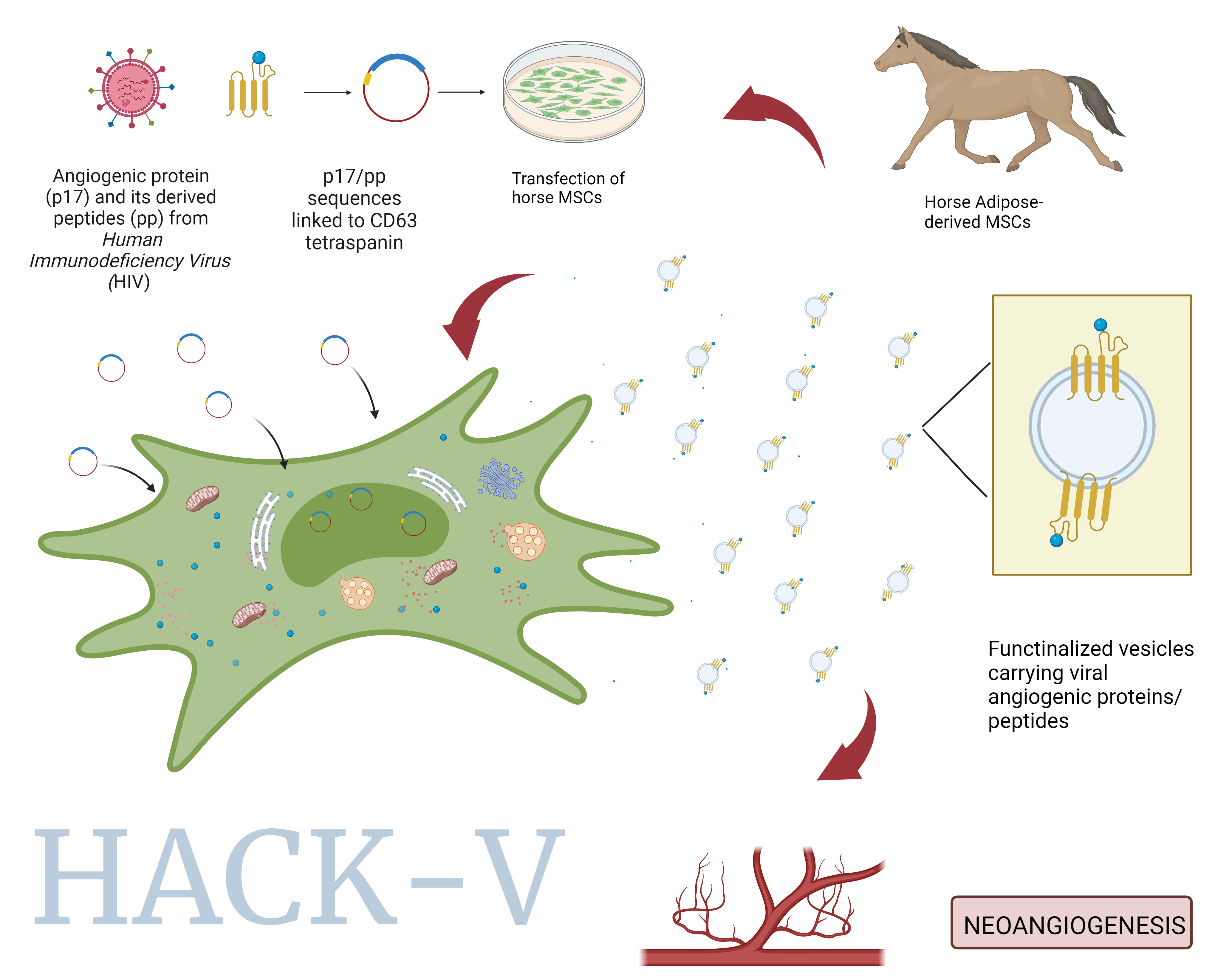 Numerose malattie dell'uomo e degli animali sono caratterizzate da un'angiogenesi insufficiente. La somministrazione di proteine angiogeniche (AP) è considerata una delle strategie più promettenti per supportare la riperfusione dei tessuti lesionati. Tuttavia, molti aspetti critici, come l'inefficienza nel raggiungere selettivamente il sito desiderato, la rapida clearance e la necessità di protezione dalla degradazione, impedisce al momento l'utilizzo delle AP. L'obiettivo principale di HACK-V è quello di sviluppare nano-vettori biologici in grado di veicolare AP nel sito lesionato in modo da preservarne l’attività a lungo termine. Il rilascio controllato di molecole ad azione farmacologica viene solitamente perseguito mediante l’uso di micro e nanoparticelle sintetiche che fungono da vettori. Tuttavia, alcune problematiche quale ad esempio il loro targeting inefficiente, la citotossicità e/o l'immunogenicità ne impediscono l'uso. Le vescicole extracellulari (EVs) sono micro e nanostrutture prodotte dalle cellule coinvolte nella comunicazione intercellulare e caratterizzate da elevata specificità per il bersaglio. Le EVs hanno il potenziale di agire come dei veri e propri sistemi di rilascio naturale (DS) a causa della loro composizione, della bassa immunogenicità, della clearance ridotta, della capacità intrinseca di attraversare le barriere biologiche e della maggiore stabilità nella circolazione sanguigna rispetto ai nano-vettori artificiali. Inoltre, possono essere modificate per esprimere molecole che facilitino il raggiungimento selettivo del bersaglio. EVs derivate da cellule stromali mesenchimali (MSC-EVs) sono state studiate precedentemente dal proponente come trasportatori di farmaci sfruttando la loro capacità di raggiungere il sito danneggiato. Le MSC possono essere ingegnerizzate in modo da “confezionare” EVs che contengano proteine terapeutiche oppure che espongano le proteine desiderate in superficie a livello dei tessuti da rigenerare. L’obiettivo di questo progetto è quello di generare MSC-EVs contenenti p17, una proteina strutturale del virus HIV e alcuni peptidi angiogenici da essa derivati che hanno dimostrato di promuovere la formazione di strutture simili ai capillari a partire da cellule endoteliali (EC) mantenute in coltura. Modelli sperimentali ex vivo ed in vivo hanno ulteriormente confermato l'attività pro-vasculogenica di p17, che sembra addirittura paragonabile a quella esercitata da VEGF-A (Vascular endothelial growth factor-A). A questo scopo, le MSC saranno ingegnerizzate per produrre EVs che trasportino la proteina nativa p17 (EV-p17) e i peptidi derivati da p17 (EV-F2 e EV-F3) così come EVs modificate per esprimere le stesse molecole sulla propria superficie. I costrutti verranno testati per valutare la loro capacità di interagire con cellule endoteliali di cavallo e di influenzare l'angiogenesi in vitro. I risultati attesi forniranno la base per l'uso delle MSC-EV come strumenti di rilascio di proteine e peptidi con potenziali proprietà terapeutiche in malattie dell’uomo e degli animali.