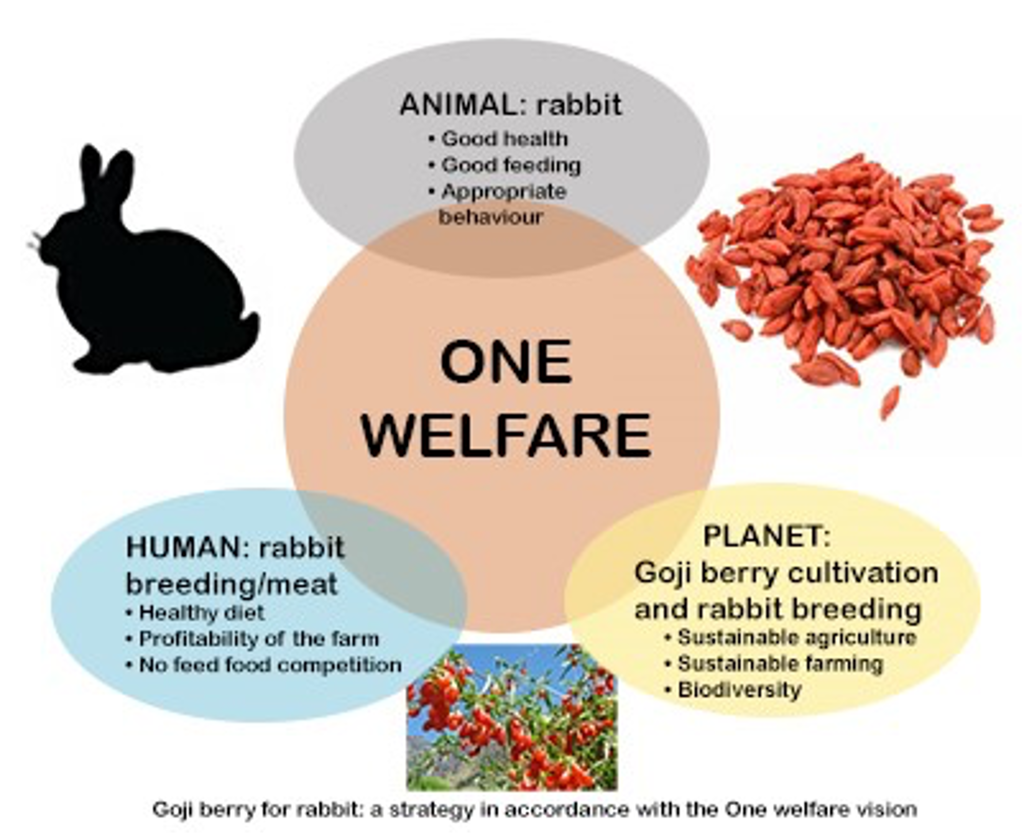 Goji berry (GB), the fruit of Lycium barbarum, is used in traditional Chinese medicine for its nutritional and therapeutic properties and it is also widespread in Western diets. However, only a few studies evaluated its effects on livestock animals, including rabbits. Despite the rabbit meat has high nutritional qualities and rabbit breeding has a role in the sustainability of rural areas, the rabbit industry is going through an economic crisis mainly due to the consumers' negative perceptions. The major concerns are welfare-related issues: use of antibiotics and hormones, feeding management, high exploitation, and scarce health care. In addition, reproductive and digestive infectious diseases cause economic losses for the farmer as they increase mortality, culling rate, and the use of drugs. The project proposes the use of GB in rabbits as a dietary supplement and additive to the final product with the overall aim to improve their immune response, reproductive and productive performance, meat quality, and marketing potential. The validation of new animal-based measures (ABMs) for rabbit welfare assessment completes this One welfare oriented approach. For this purpose, 3 different experimental trials will be conducted. The first will evaluate the preventive effect of dietary GB on the rabbits reproductive and digestive functions using LPS-induced models of local and systemic inflammation. The samples from the gonadal axis, genital, and digestive tract will be analyzed with histological, immunohistochemical and molecular biology analyses to evaluate changes in the tissue organization and expression of orexigenic and anorexigenic peptides, TLR-4, pro and anti-inflammatory cytokines, antioxidant enzymes, and microbiota. Sex hormones and cytokines plasma concentrations will be also determined. The second experiment will evaluate the effects of GB on the digestive functions, immune response, and meat quality. The digestive tract functionality, the microbiota and the metabolic hormonal pattern will be evaluated by molecular biology, immunohistochemical, and radioimmunological techniques. Moreover, the effect of GB as an ingredient into processed meat will be investigated analyzing the meat quality, shelf life, and its potential anti-Listeria effects. Finally, a tool for pain assessment in farmed will be developed, applied, and then validated. This experiment will provide a ready-to-use tool for both veterinarians and breeders to early identify animals suffering from diseases and will define new ABMs for legislation to protect the rabbit's welfare. The project, thanks to a One welfare orientation and a multidisciplinary approach, will bring new knowledge on the relationship between nutrition, inflammation, reproduction, productivity, meat quality, and welfare of the rabbit. Its impact can be extended to scientific, economic, and ethical fields as benefits could concern not only animal welfare but also farmers, consumers, and sustainability.