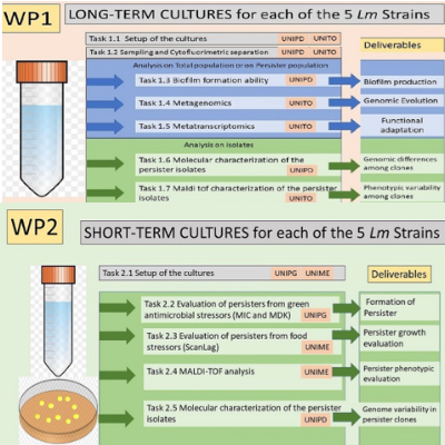 La persistenza nell'ambiente alimentare (strutture e prodotti) di Listeria monocytogenes (Lm) è un problema sfidante nella gestione della sicurezza alimentare. Lm è ancora la prima causa di mortalità nelle infezioni di origine alimentare e la tendenza è sempre in aumento. L'obiettivo del progetto è far progredire le conoscenze sulla persistenza di Lm. La persistenza e la formazione di cellule persister in cinque ceppi di Lm verranno saranno studiate utilizzando un sistema in vitro in presenza di stress subletali (deprivazione di nutrienti, refrigerazione a T°C, basso pH, bassa Aw, stress termico, antimicrobici), utilizzando due approcci diversi. Il primo approccio prevede la creazione di colture a lungo termine in grado di simulare la persistenza in vitro. Un singolo stress (deprivazione di nutrienti) o due tipi di stress (deprivazione e refrigerazione) saranno imposti cronicamente alle colture a lungo termine con l'obiettivo di simulare ciò che potrebbe accadere in un ambiente alimentare reale. Le popolazioni delle colture a lungo termine (cellule persister e non persister) saranno analizzate come popolazione totale o separate mediante citofluorimetro e analizzate separatamente. Inoltre, le colture a lungo termine saranno analizzate per la capacità di formare biofilm, una caratteristica dei batteri spesso associata alla persistenza. Infine, verranno effettuate analisi metagenomiche e metatranscriptomiche sulla popolazione totale e sulle due popolazioni separate e analisi WGS e MALDI-TOF sui ceppi isolati da entrambe le popolazioni. Nel secondo approccio, si valuterà la formazione di cellule persister in seguito a diversi tipi di stress (colture a breve termine), sia quelli classici presenti nell'industria alimentare (temperatura, acidità, detergenti), sia quelli derivanti da antimicrobici naturali. La formazione di cellule persister sarà monitorata con il sistema MIC/MDK o con lo Scan-Lag. Gli isolati persister saranno caratterizzati sia fenotipicamente sia genotipicamente (analisi WGS e MALDI-TOF).